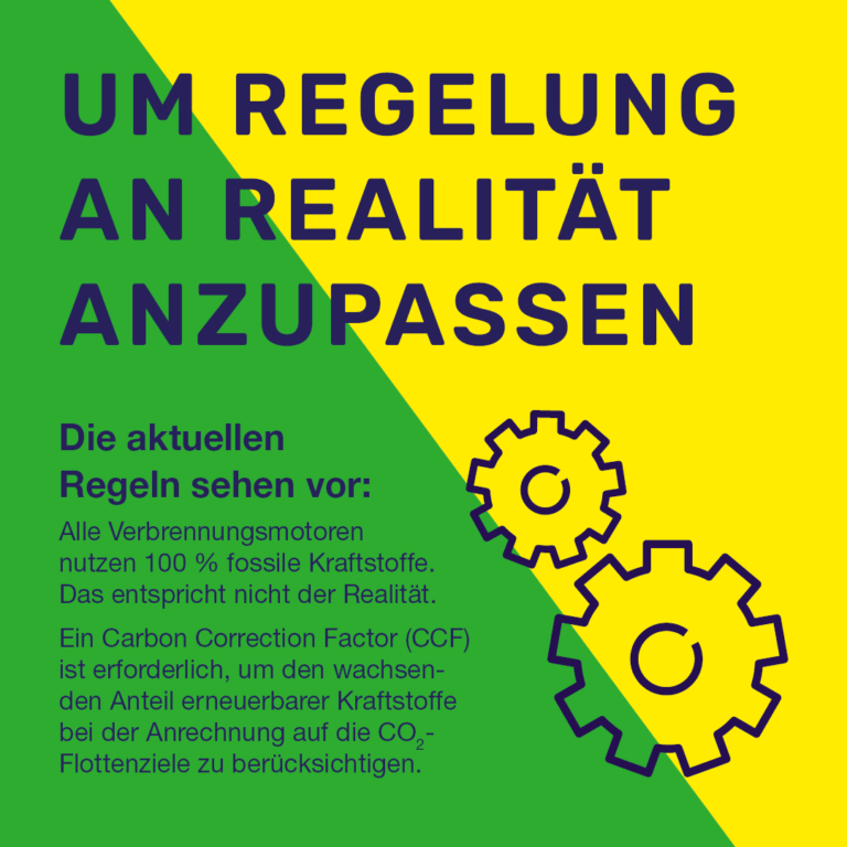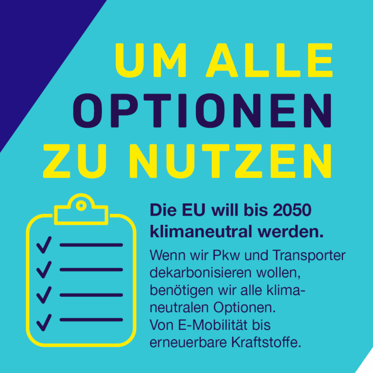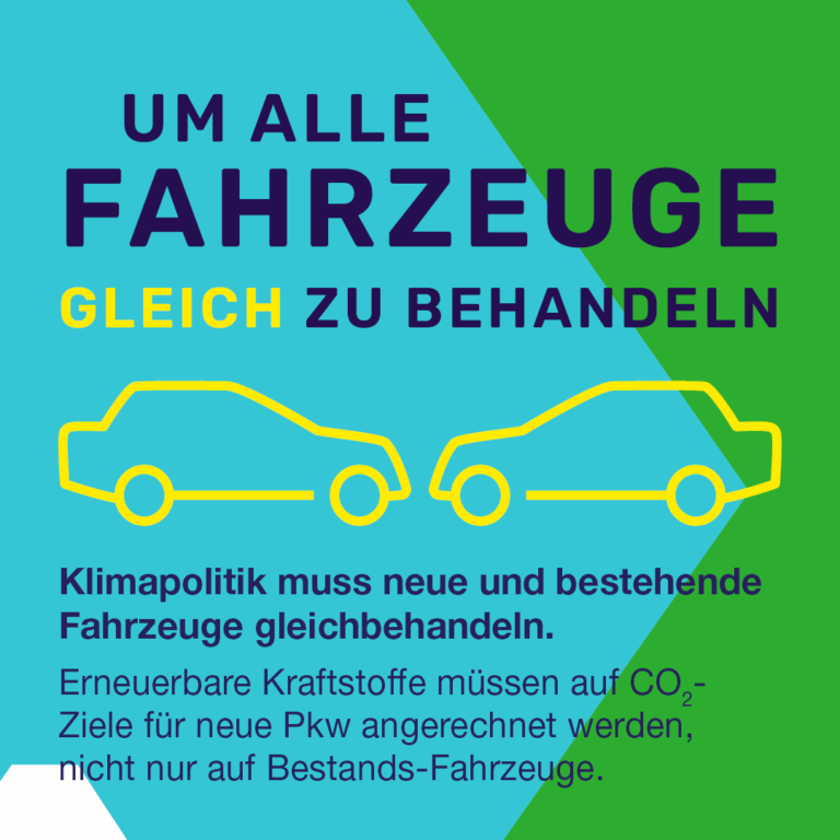 Trotz des beschleunigten Hochlaufs der Elektromobilität müssen erneuerbare Kraftstoffe einen großen Beitrag zum Erreichen der Klimaziele im Verkehrssektor leisten – zusätzlich zu Plug-in-Hybridfahrzeugen und Elektrofahrzeugen mit Reichweitenverlängerung. Sie sollten deshalb in der EU-Flottenregulierung für Pkw und leichte Nutzfahrzeuge als Klimaschutzoption berücksichtigt werden – so wie Strom für batteriebetriebene Fahrzeuge.