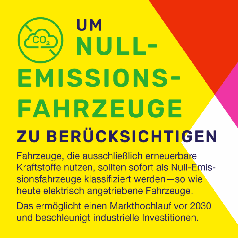 Aus diesem Grund ist die Einführung einer neuen Fahrzeugkategorie notwendig: Neufahrzeuge, die ausschließlich CO2-neutrale Kraftstoffe (Carbon Neutral Fuels, CNF) tanken, sollten als Null-Emissionsfahrzeuge behandelt werden. Das ist heute bereits bei batterieelektrischen und Brennstoffzellen-Elektrofahrzeugen der Fall.