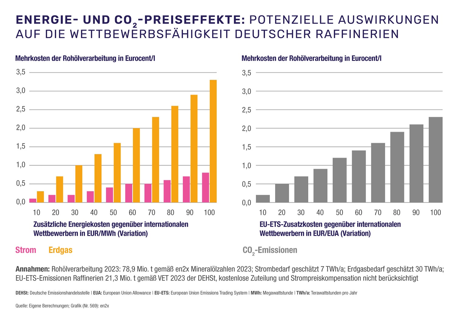Erstens, die Energiekosten: Hohe Energiekosten: Die linke Grafik zeigt, wie sich der relative Mehrpreis für Energie (Strom bzw. Gas) in Euro/Megawattstunde auf die Rohölverarbeitung auswirkt (Mehrkosten in Cent/Liter). Aufgrund dieser Energiekostendifferenz können im internationalen Vergleich die zusätzlichen Verarbeitungskosten hierzulande bereits drei bis vier Cent je Liter betragen.